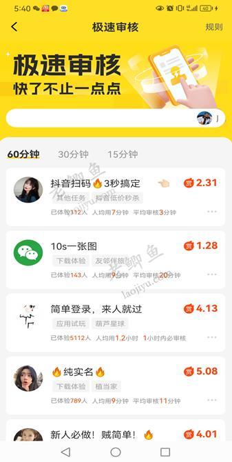 这款悬赏任务平台比众人帮还要好。在平台首页就有推荐的“极速审核”任务,包括审核15分钟、30分钟、60分钟三个时长的任务,真正做到了悬赏快速赚钱,这也是在这款平台中做任务赚钱的优势所在。