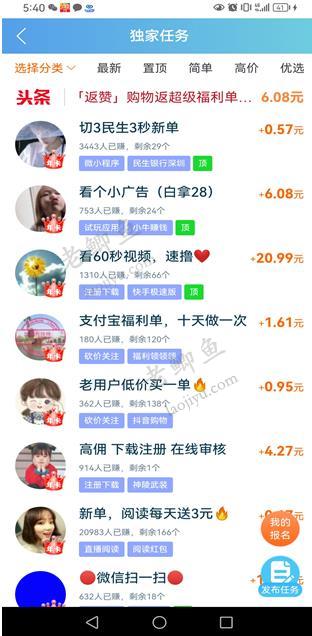 在平台任务大厅中还有不同分类的简单、优选、最新、置顶等任务,我们任意报名其中的悬赏任务就能完成赚赏金。